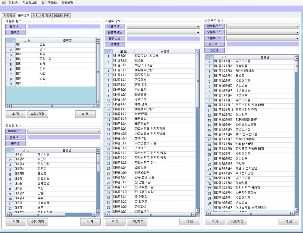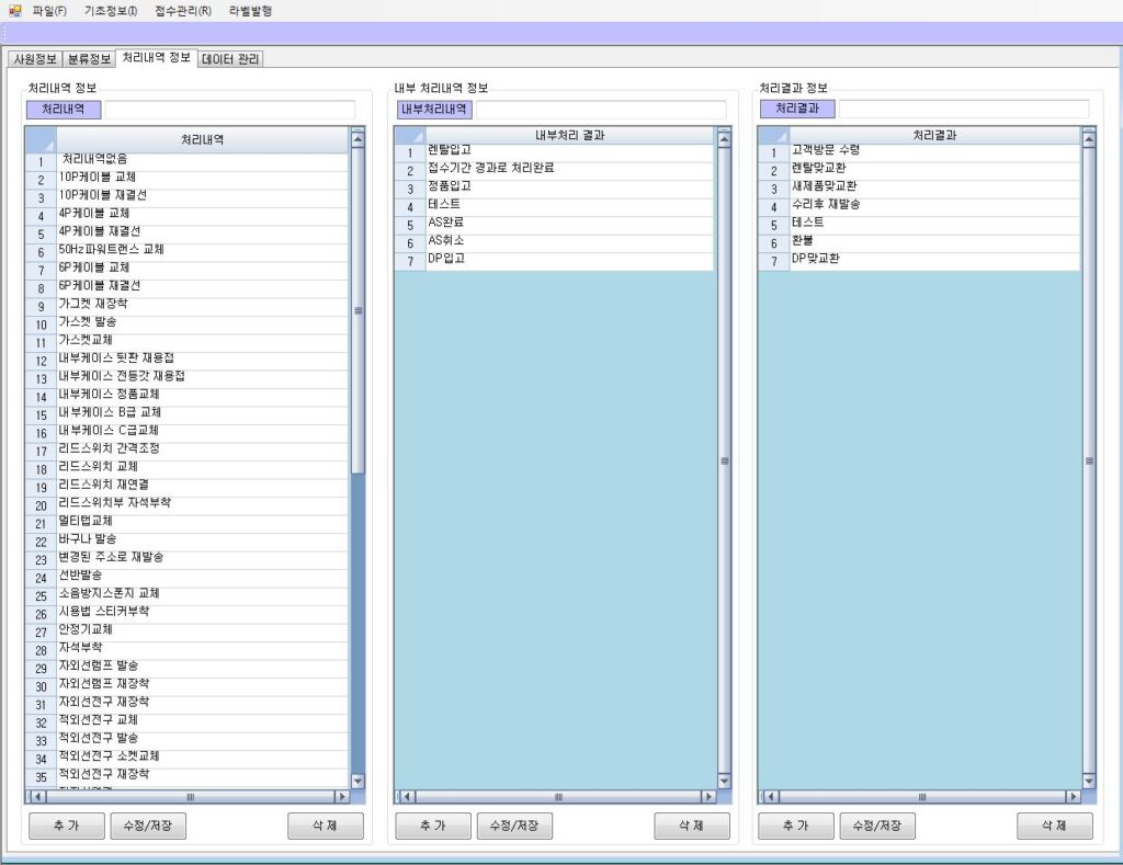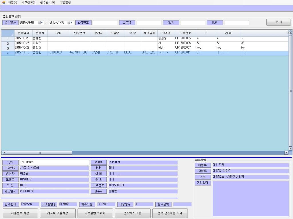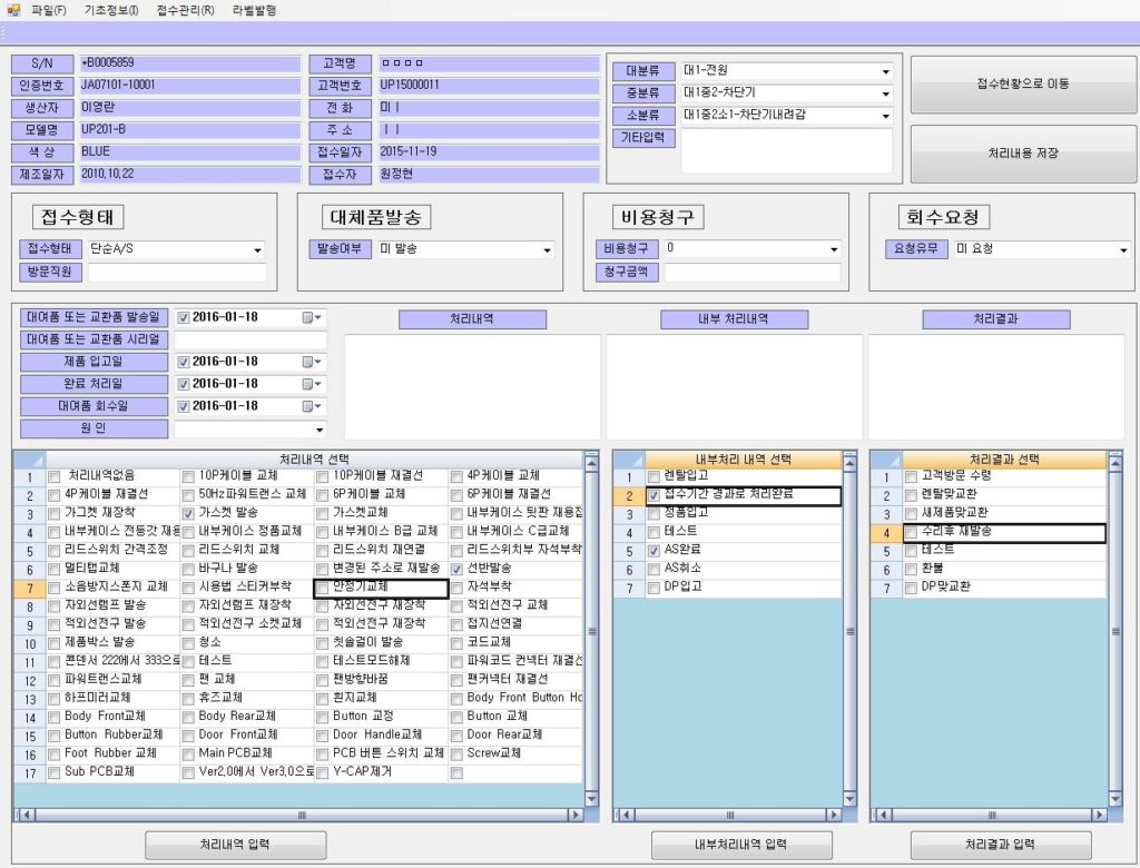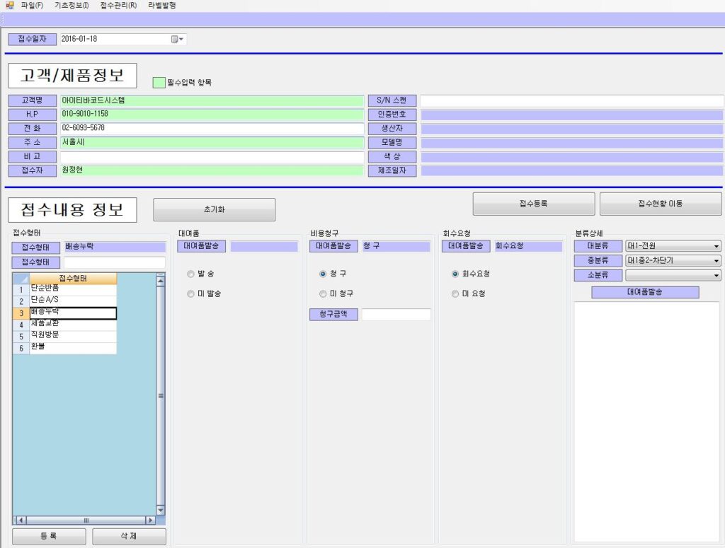 이력 관리의 시발점: 여기서 등록된 정보는 이후 접수, 수리, 출고 전 과정의 추적(Traceability) 기준이 됩니다.